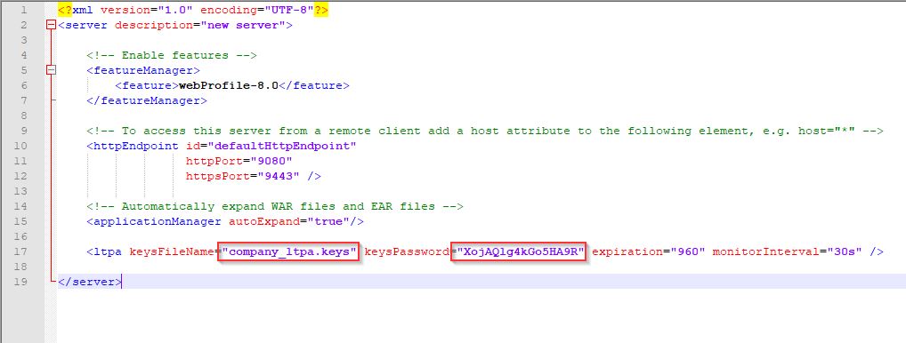 As soon as you get the server fired up, a new LTPA token will be generated in “<was_liberty_package>\wlp\usr\servers\defaultServer” directory, with the name and password you specified in the “server.xml” file.