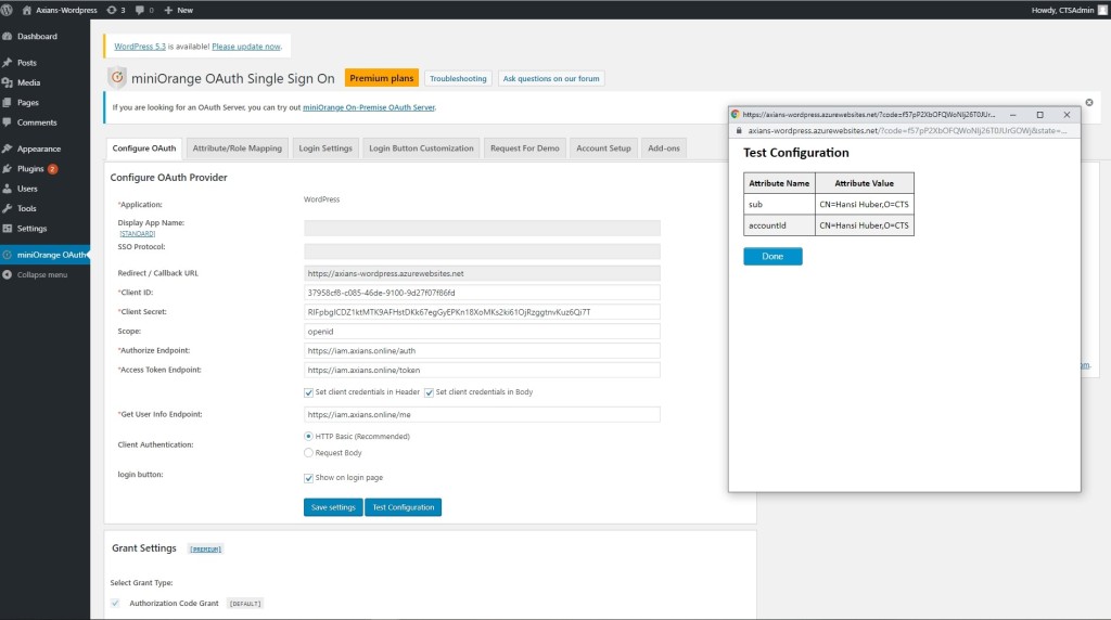 After a client secret with which the plugin could work was generated, we have hit the next problem, the Plugin and the OAuth Authentication works, but after a user logs in, the IAM is only sending “sub” and “accountId” user attributes to the WordPress Server. The issue here is that the free version of the MiniOrange Plugin only supports “mail” attribute at this point, the support is working on a trial version which we could try out with IAM found in the AppDev Pack.