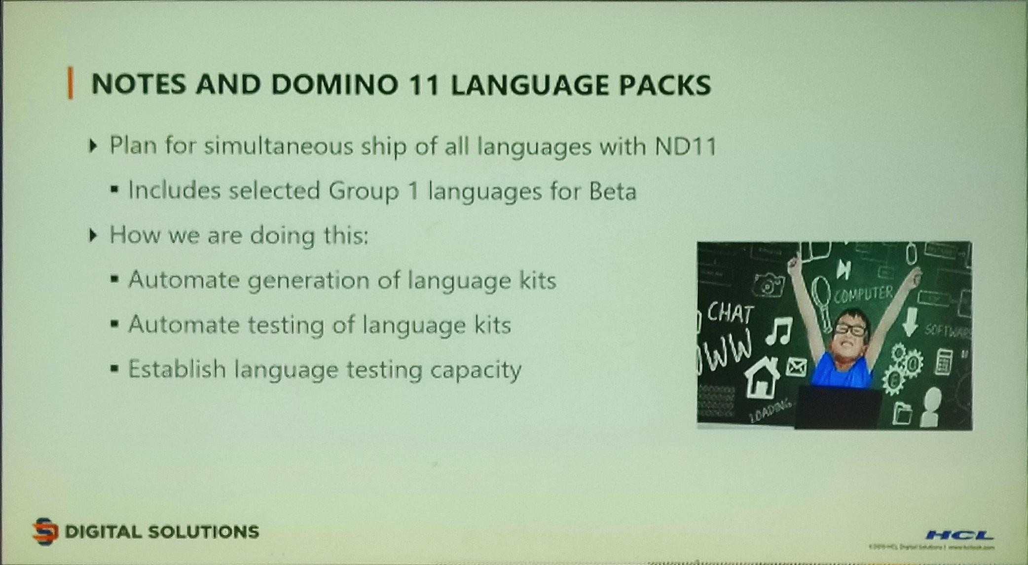 Notes and Domino 11 Language Packs will be shipped simultaneously with the new version of the software, so there is not going to be a delay between the release of the new version and the language packs.
