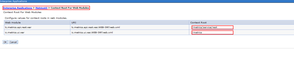After making the changes mentioned above, we proceeded to make similar changes for the “MetricsUI” application, here we changed the Context Root from “/metricssc/service/rest” and “/metricssc” to “/metrics/service/rest” and “/metrics”: