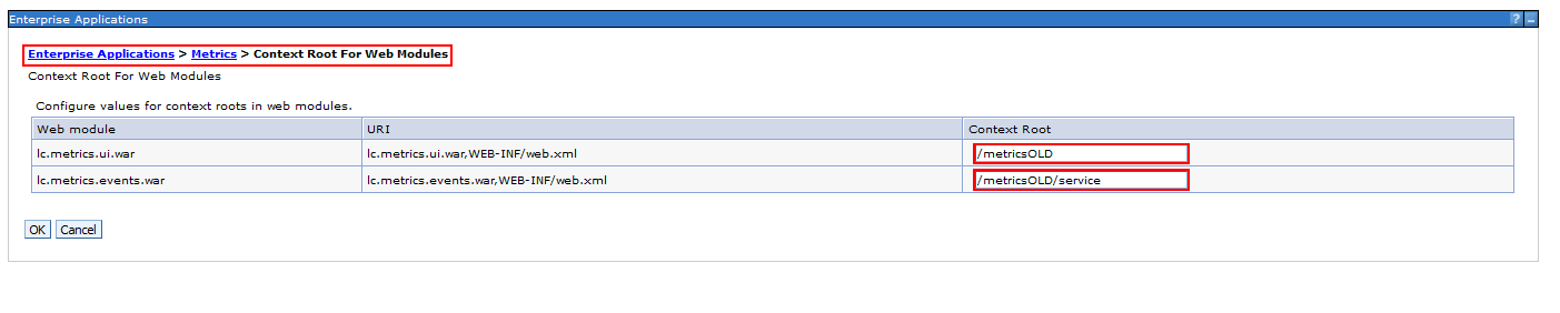 We have set the “Metrics” application context root from “/metrics” and “/metrics/service to “/metricsOLD” and “/metricsOLD/service” respectively:
