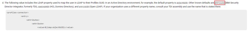 The following value includes the LDAP property used to map the user in LDAP to their Profiles GUID. In an Active Directory environment, for example, the default property is objectGUID. Other known defaults are entryuuid (IBM Security Director Integrator, formerly TDI),…