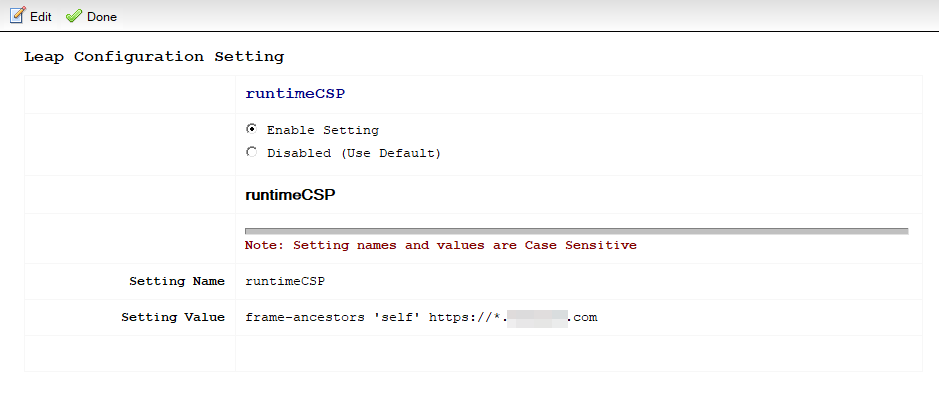 To address these limitations, I disabled the “runtimeCSP” setting and added a new Domino Web Site Rule to override the default CSP settings set by Leap: