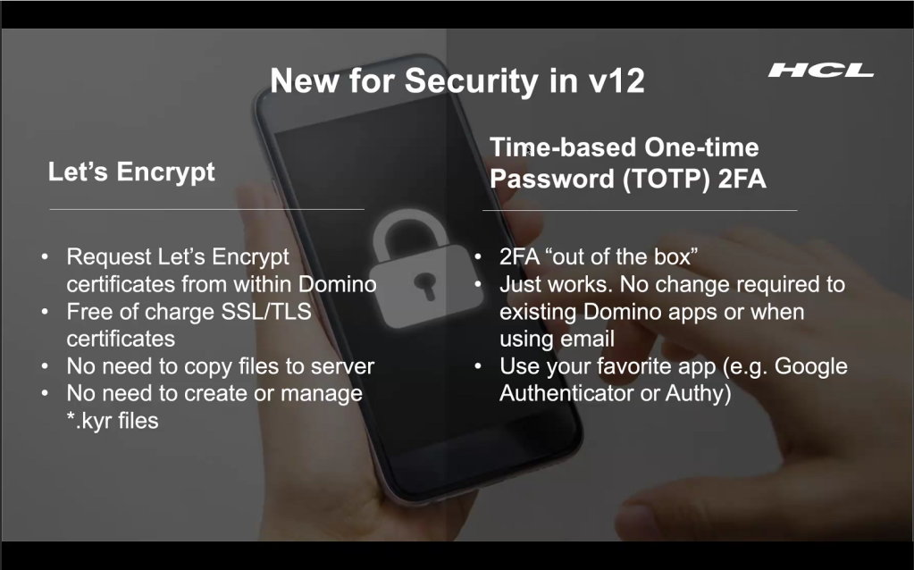 A few new security features will also be implemented. As mentioned, 2FA and biometric authentication on mobile devices will be supported out of the box as well as the whole process of obtaining and using the Let’s Encrypt SSL certificates. Active Directory Password Sync will also be available in the next release, one password for AD, HCL Notes and Domino Web Access, finally! :-)