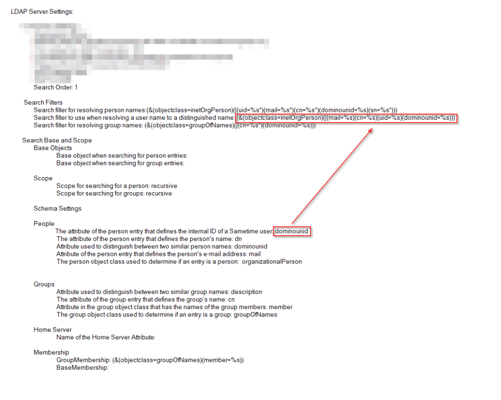 Seeing this, the solution for the issue was pretty straightforward. The Sametime Internal User ID was set to “dominounid”, and it this parameter was missing from the LDAP Search filter used when resolving the user distinguished name to Sametime internal username. In order to solve this I had to modify the value of the LDAP search filter, used for resolving usernames to distinguished names, to include the “dominounid” parameter.