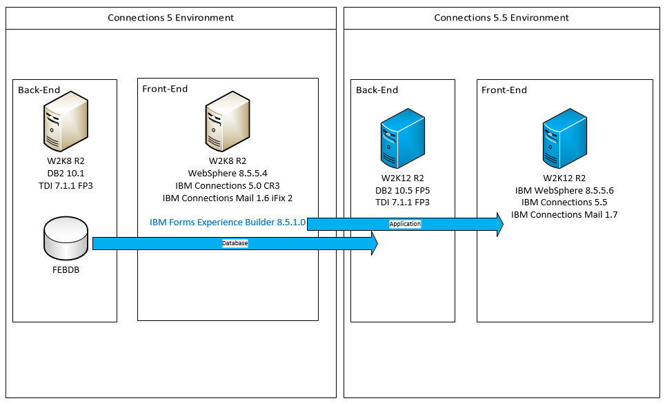 Our Connections 5.5 environment, we are going to be using, consists of two Windows Servers. On one server we have WAS 8.5.5.6 running (DMGR, WAS Node and IBM HTTP Server), on the other one we have DB2 and TDI running. Connections 5.5 with ICM 1.7 is already installed. I also performed a Connections Side-by-Side migration in order to move the user data to the new environment. In the old Connections 5 environment we have previously installed “Forms Experience Builder” version 8.5.1.0. You can take a closer look on our environment in the following picture: