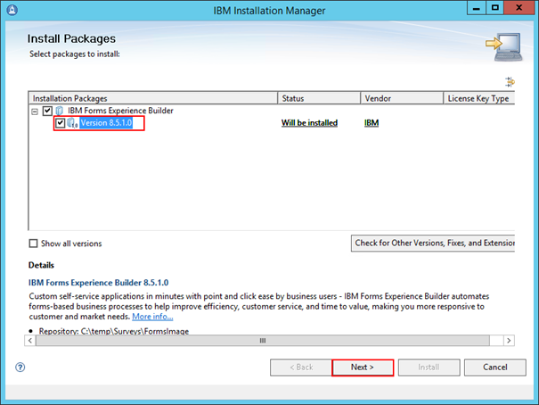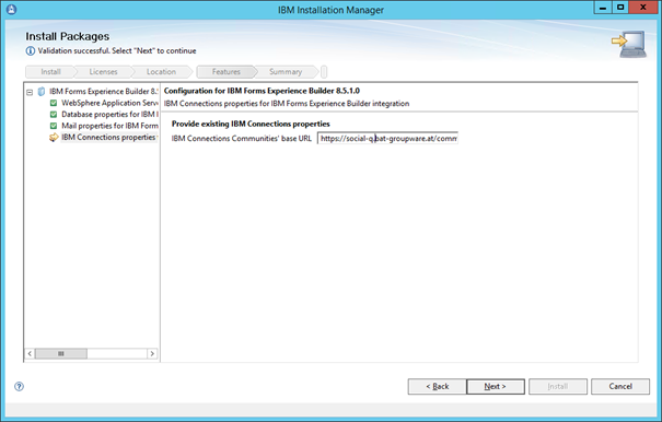 Fill in the values and click “Validate”, upon the successful validation the Button next will become visible. My DMGR runs on the same server as the WAS node where I am installing Community Surveys so I can use “localhost” for the “Deployment Manger host name”, if you are installing Community Surveys on a separate node, you will need to enter the actual hostname of DMGR. You can also use another Application Server Profile, I am using a Medium Deployment and I do not have to many users in my test environment so I have chosen to stick with “PushCluster_server1”.