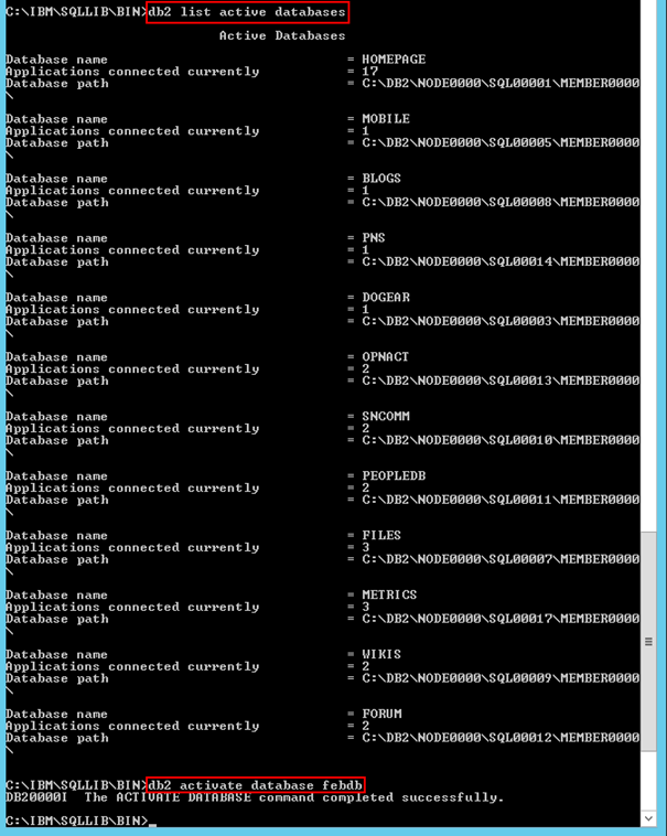 Check if the newly restored FEBDB database is active on the db2 Server, if not activate it like I did in the following: