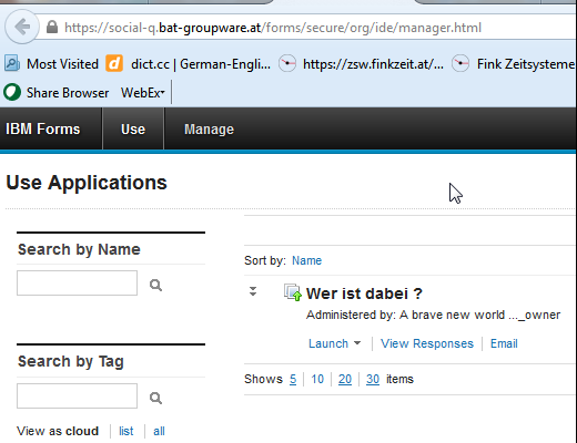 The next thing to do is to check if you have some FEB Applications on the old server, which you can access with your standard user account, as a reference to check in the end if the migration was successful. If you do not have them, create some FEB Applications and Surveys in Connections. You should also make sure that you have an administrative account with which you can access all FEB Applications on the old server, “wasadmin” should do the trick. You can check that by logging into the Forms Application on the old server, open your Web browser and enter “https://<connections_server_url>/forms”.