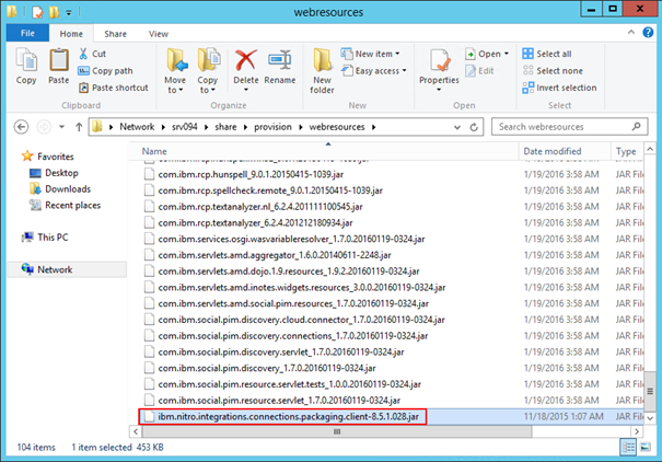 - Copy the “ibm.nitro.integrations.connections.packaging.client-8.5.1.028.jar” file from “\<FormsExperienceBuilder_installation_root>\deploy\widget” into “\<connections_shared_directory>\provision\webresources\”.