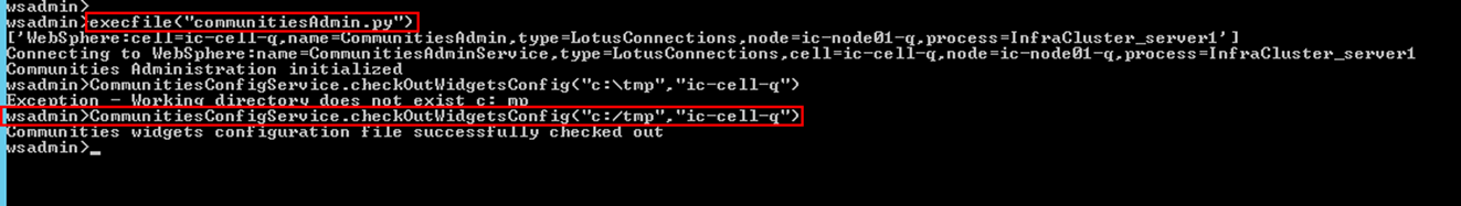 Next we will need to edit the “widget-config.xml” file. To do this you will need to initialize the wsadmin Prompt and check out the Community configuration files. You can use the same cmd where the wsadmin Prompt is already initialized.