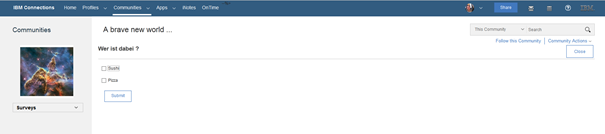 You can integrate Community Surveys with IBM Connections Communities, in order to do that you will have to enable the two Survey Widgets.