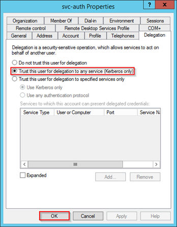 This is quite easy to forget, no matter what you do, Kerberos won´t work if your Service User Account used in the “KTPASS” command does not have the following setting set: