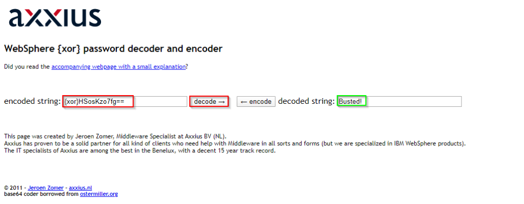 Then just copy the value of the “password” attribute, now we need to decode the xor encoded password. For that I am usually using the following Website: https://strelitzia.net/wasXORdecoder/wasXORdecoder.html